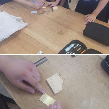 2年生の技術の授業の様子です。本日より金属加工を行っています。卓上ボール盤や金切りばさみ、その他工具を使い黄銅板でキーホルダーを作ります。