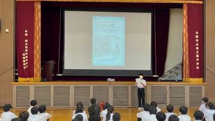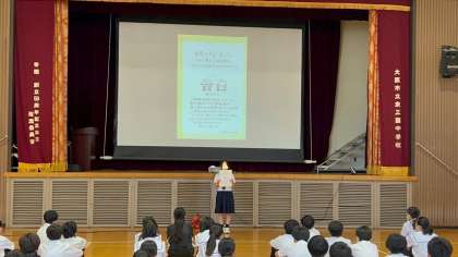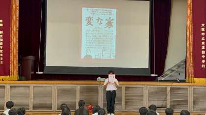 一年生の学年集会の様子です。各クラスの代表による読書紹介を行いました。聞き手をひきつける話し方を工夫して、大変良い発表でした。