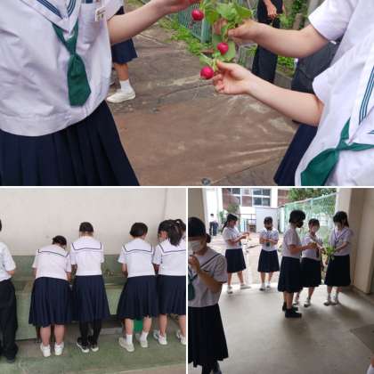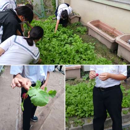 2年生の技術の授業の様子です。「生物育成の技術」についての学習です。今日はラディッシュの収穫を行いました。収穫だけではなく栽培記録の振り返りも行いました。