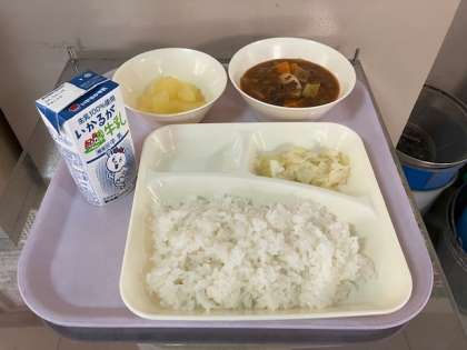 今日の給食は、ハヤシライス、牛乳、キャベツのゆずドレッシング、りんご(カット缶)です。