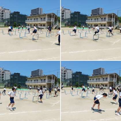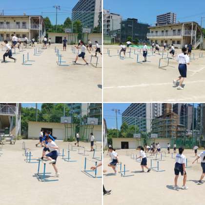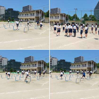 2年生の体育の授業の様子です。「ハードル走」の練習に取り組んでいました。走り方のリズムや飛び方、タイミング等を先生が声をかけていました。苦手にしていた生徒も、コツを掴んだらスムーズにハードル走ができていました。