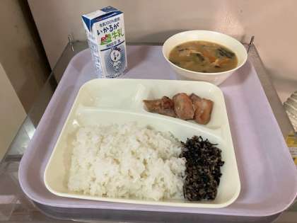今日の給食は、ごはん、牛乳、鶏肉のてり焼き、みそ汁、魚ひじきそぼろ、です。