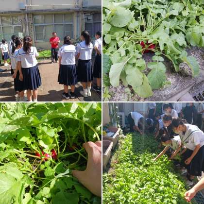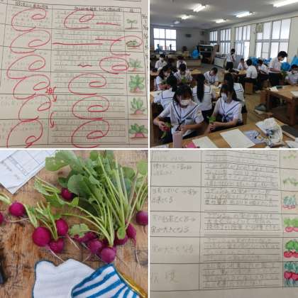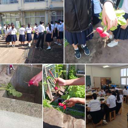 2年生の技術の授業の様子です。今日は「生物育成の技術」について学習しています。ラディッシュの収穫をしました。昨年の冬より今年の方が収穫日数が早かったことやその理由、肥料の効果等の話が先生からありました。そして栽培の全工程について再度確認しました。