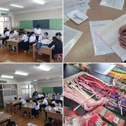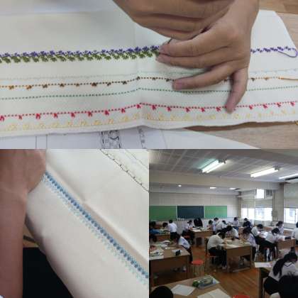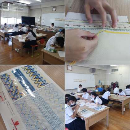 2年生の家庭科の授業の様子です。「スウェーデン刺繍」の縫い付け実習をしています。なかなか慣れない手縫い作業でしたが、数週間の練習でしっかりやり方が身につきました。スムーズに縫うことができていました。