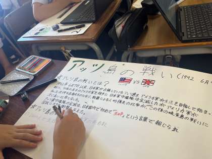 一年生は平和学習を行いました。年表づくりが進んでいます。うまく役割分担しながら,話し合いを行なっています。太平洋戦争に至るまでに、色々な出来事があったことを学んでいます。