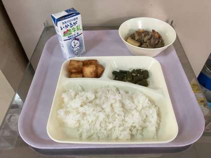 今日の給食は、ごはん、牛乳、肉じゃが、あつあげのみそだれかけ、オクラのおかかいため、です。