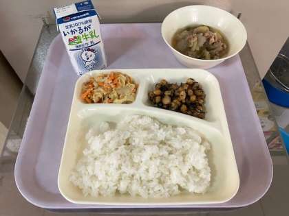 ひじきには、骨を強くするカルシウムや腸を綺麗にする食物繊維が含まれています。また、皮膚を健康に保つビタミンAも含まれています。今日の給食では「ひじき豆」で登場します。