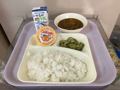 今日の給食は、夏野菜のカレーライス、牛乳、きゅうりのサラダ、みかんゼリー、です。