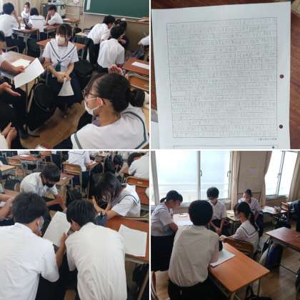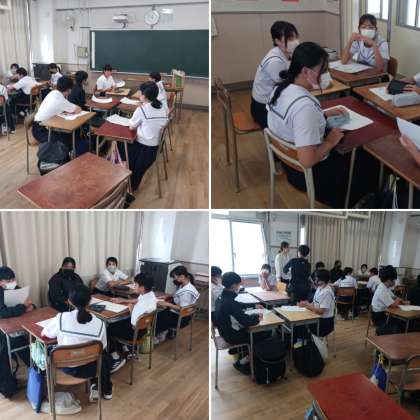 2年生総合の授業は平和に関する取り組みを行っています。今まで取り組んできた平和に関する調べ学習の内容をポスターにしました。今日はグループで生徒個人が作ったポスターの内容を発表しています。