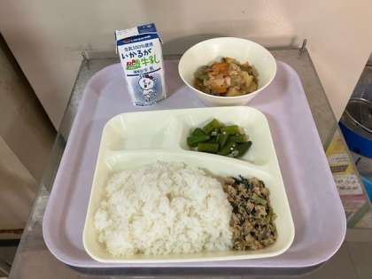今日の給食は、ごはん、牛乳、鶏肉と野菜のみそ煮、オクラの梅風味、ツナっ葉いため、です。