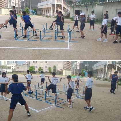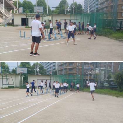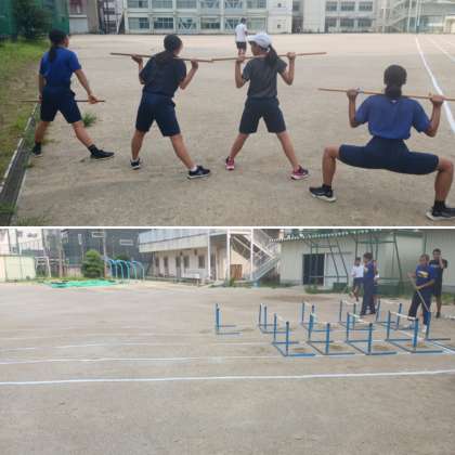 陸上部の様子です。顧問の先生の細かいアドバイスの下、トレーニングに励んでいます。部員同士が声をかけあいながら練習する姿は、とてもよい雰囲気を出していました。