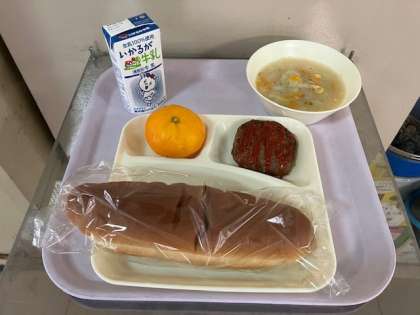 今日の給食は、黒糖パン、牛乳、焼きハンバーグ、ケチャップ(袋で焼きハンバーグに使います)、豆乳スープ、ミカン(冷凍)です。