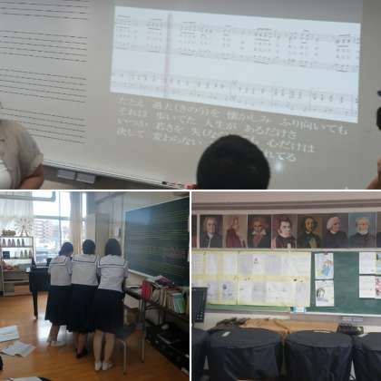 2年生の音楽の授業の様子です。歌唱練習を行っています。男子パートと女子パートと別れて、それぞれ歌唱練習をしています。担当の先生の、男子パートの細かい工夫の説明を聞いています。とてもきれいな歌声が響きました。