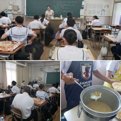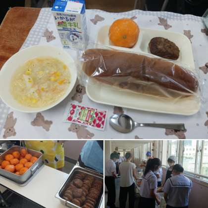 2年生の給食の様子です。給食当番の生徒が指定された場所で給食を受け取り、教室に運んでいます。久しぶりの当番の仕事でしたがクラスのためにスムーズに運んでくれました。今日の給食はハンバーグ。冷凍みかんもありました。人気なメニューが多いですね。午後からの授業や取り組みも頑張りましょう。