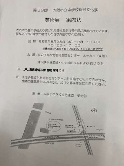 8月28日(水)から9月1日(日)10:00〜17:00の期間、阿波座にある「江之子島文化芸術創造センター ルーム1(4階)」にて「第33回 大阪市立中学校総合文化祭」が開催されます。大阪市の各中学校から選ばれた作品が展示されます。本校の生徒の作品も出展されています。ぜひ、ご覧ください。