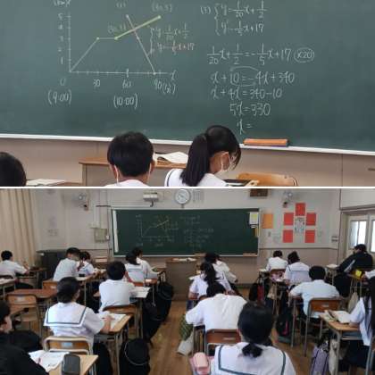 2年生の数学の授業の様子です。一次関数の利用についての単元学習です。一次関数のグラフの読み方や書き方は慣れるまでが難しいですね。先生の説明を聞いて、たくさん練習問題を解いて、問題に慣れていきましょう。