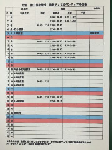 学校元気アップボランティアの12月予定表もできました。