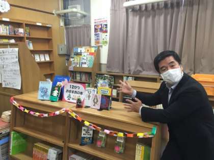 図書館の本棚も12月バージョンに模様替え。