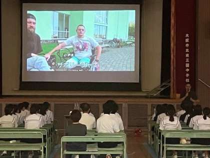 西谷様からは、現在も争いが続いているロシアとウクライナ、ガザとパレスチナの話をしていただきました。直接現地で取材をした映像を見せていただき、争いの始まった経緯や現状などの説明をしていただきました。私たちがテレビなどのメディアで見るものではなく、私たちが見聞きしてきたことではなく、西谷様が実際に現地で聞いて見たことを子どもたちに伝えていただいたことで、あらためて「平和」について考えることができました。