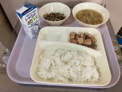 今日の給食は、ごはん、牛乳、さけのつけ焼き、五目汁、高野どうふのいり煮、です。