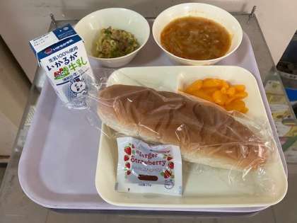 今日の給食は、コッペパン、いちごジャム、牛乳、カレーマカロニグラタン、トマトスープ、みかん(缶)です。