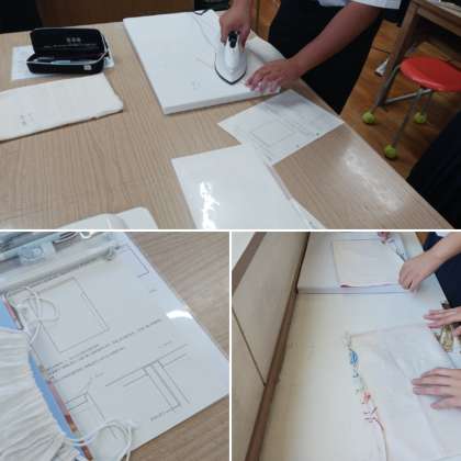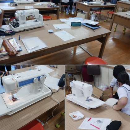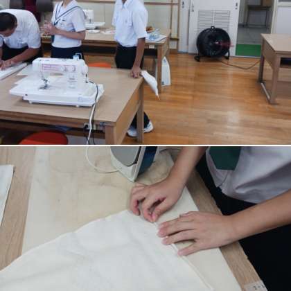 2年生の家庭科の授業の様子です。ミシンとアイロン掛け作業を行っています。お家でも両方ともしたことがある人もいると思います。日常生活の中でも大切な作業ですね。今日も実習を通して火傷等けがなく作業できました。