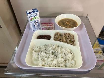 ※今日の給食では、「豚肉の甘辛焼き」が調理器具(焼き物機)の経年劣化による不調により「豚肉の甘辛いため」に変更いたしました。しばらくの間、焼き物機の工程を釜等に変更します。材料の変更はありません。