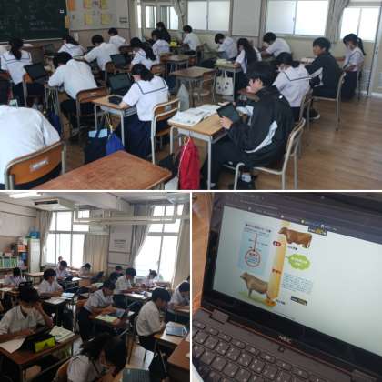 2年生の技術の授業の様子です。生物育成の技術について学習しています。今日は動物を育てる技術について学習しました。牛の1日の管理作業、管理技術について各自が調べて発表しました。