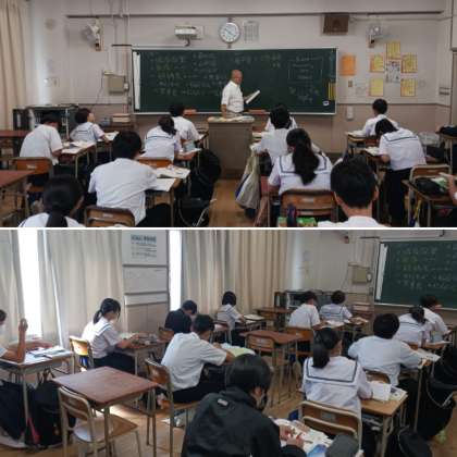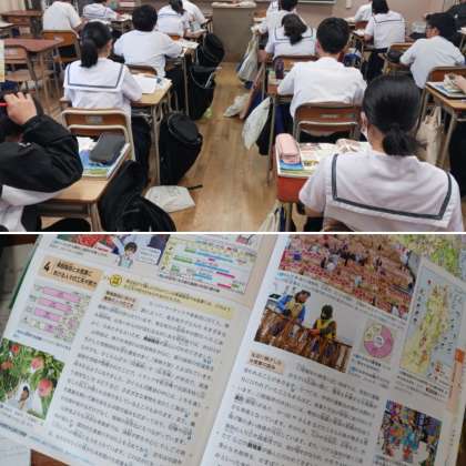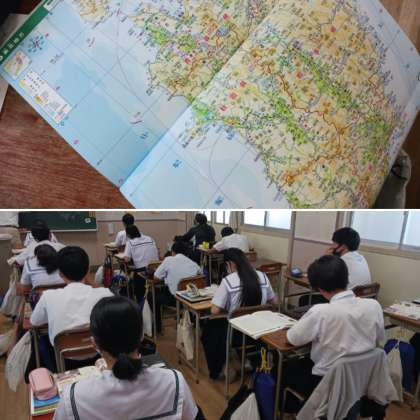 2年生の社会の授業の様子です。東北地方について学習しています。東北地方の果樹栽培と水産物における人々の工夫や努力について先生から説明がありました。