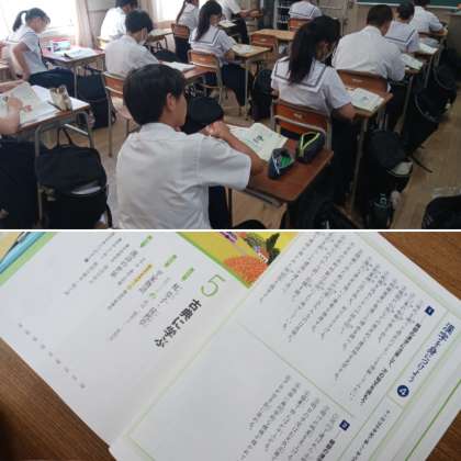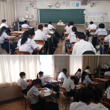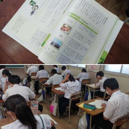 2年生の国語の授業の様子です。古典の学習をしています。枕草子や徒然草について学習しています。先生の音読に続き古文の読み方を確認しています。