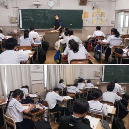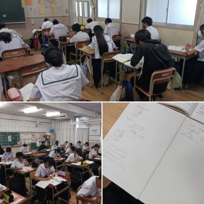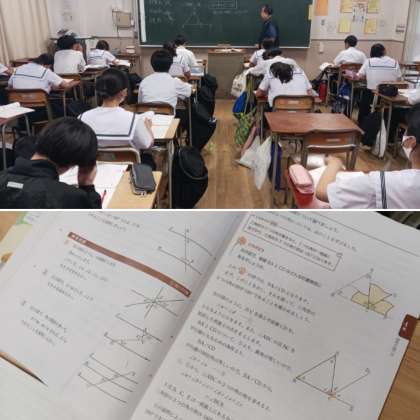 2年生の数学の授業の様子です。多角形の角について学習しています。三角形の角の性質について先生から説明がありました。1年生の既習事項の復習内容も多いので、家庭学習でも振り返っておきましょう。