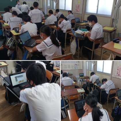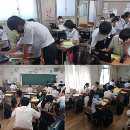 2年生の技術の授業の様子です。生物育成の技術について学習しています。牛、豚、鳥など、生活をおくる上で必要となる家畜の1日の管理作業や管理技術についてChromebookで調べてまとめています。
