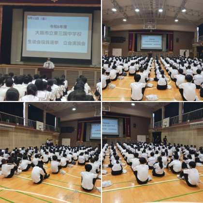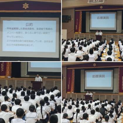 今日の6限、体育館にて生徒会役員選挙が行われました。会長1名、副会長1名、執行委員3名の募集を行い、2年生から1年生の生徒が立候補してくれました。挨拶と公約を立候補者が述べた後、応援演説がありました。選挙管理委員の投票の諸注意の後、生徒は教室へ戻り、投票を行いました。