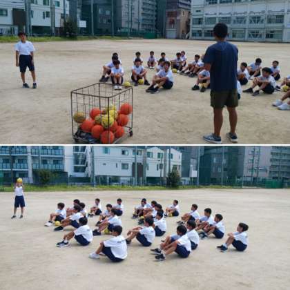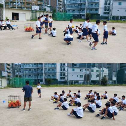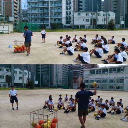 2年生の男子の体育の授業の様子です。ハンドボールを行っています。今日はパスの技術について学習しています。ハンドボールで使うパスは数種類あるのですね。