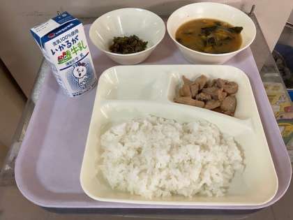 今日の給食は、ごはん、牛乳、鶏肉のてり焼き、かぼちゃのみそ汁、なすのそぼろいため、です。
