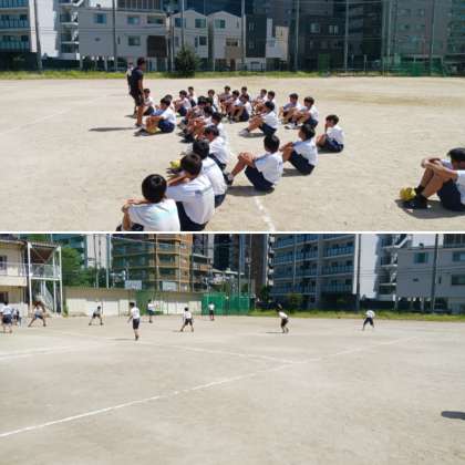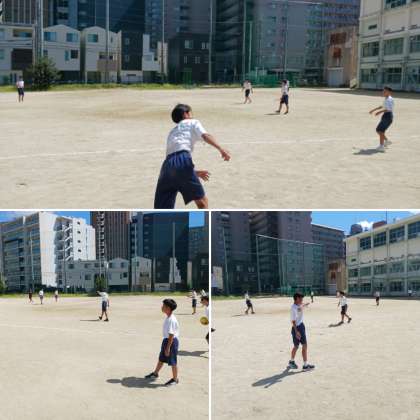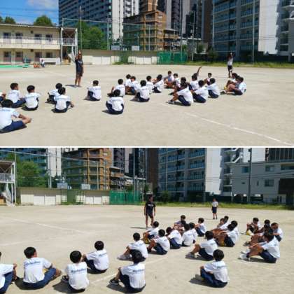 1、2年生の男子体育の授業の様子です。ハンドボールについて学習しています。今日はシュートの仕方を練習しています。足の歩数、ジャンプ、投げ方、どれも難しいですが先生から教わった事を実践しています。