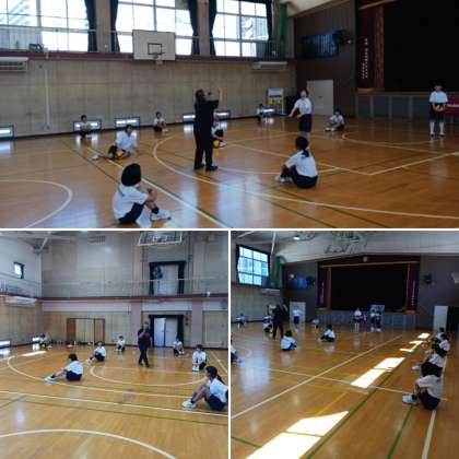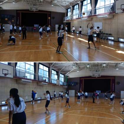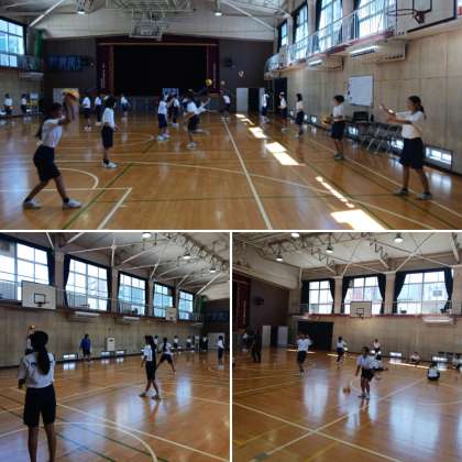 1、2年生の女子体育の授業の様子です。バレーボールを行っています。トスの練習を行っています。細かい技術について先生から説明がありました。先生の話の後、コツをつかむことができたのですね、とても上手にトスができていました。