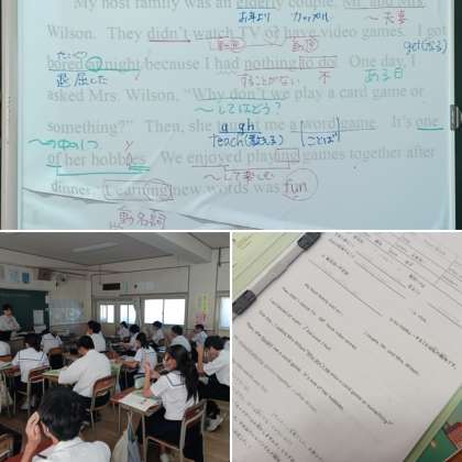 2年生の英語の授業の様子です。今日は「Read and Think」の単元を学習しています。文法事項の確認や日本語訳について先生から説明があり、しっかりと聞いています。