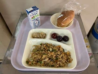 今日の給食は、ミニコッペパン、牛乳、オイスターソース焼きそば、もやしのしょうがづけ、ぶどう(巨峰)、です。