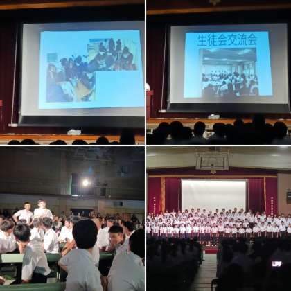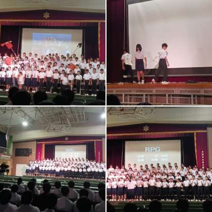 体育館で開会式を行いました。トップバッターは生徒会のこれまでの活動の発表。次に、1年生のこれまでの活動を紹介した後、全員でSEKAI NO OWARIの「RPG」を合唱しました。