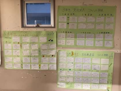 各学年の廊下に、9月27日(金)に行われた文化発表会の各展示などの感想を掲示しています。みなさんの頑張りを書いてくれています。