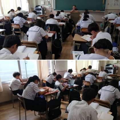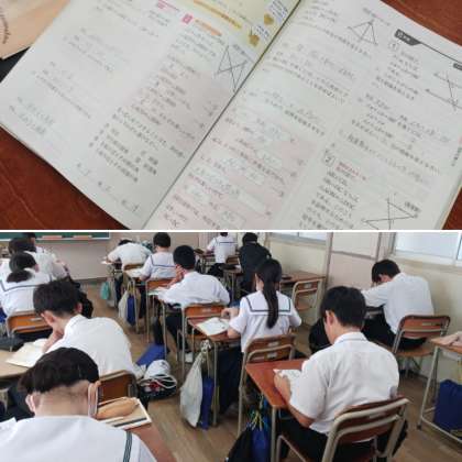 2年生の数学の授業の様子です。今までに学習してきた「証明」を含む練習問題を、ワークブックで練習問題を解いていきました。しっかり復習はできたでしょうか。