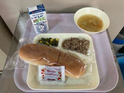 今日の給食は、コッペパン、いちごジャム、牛乳、豚肉のガーリック焼き、鶏肉と野菜のスープ、さんどまめとコーンのソテー、です。