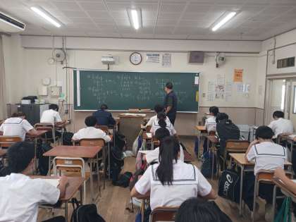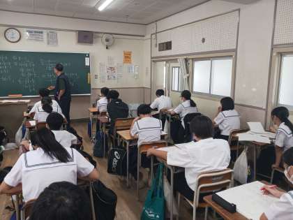 2年生の数学の授業の様子です。今日ははテスト返却と今までの復習です。計算問題について先生から解説があり、計算間違いが起こりやすい箇所のアドバイスや実際に途中式の板書から確認を行いました。