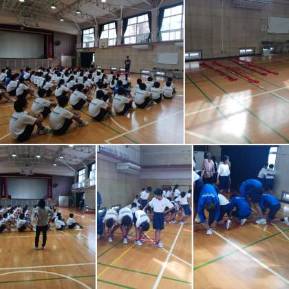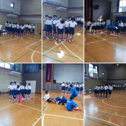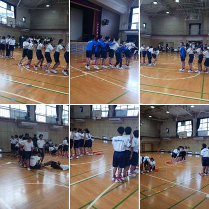 本日の総合の時間を使い、2年生は学年種目の練習を行いました。競技はムカデ競走。1チーム7〜10人程度の編成でチーム全員の息がぴったり合わないと進まない競技。最初はこけているチームがたくさんありましたが、チームで声を掛け合い上達しました。当日まで作戦会議です。