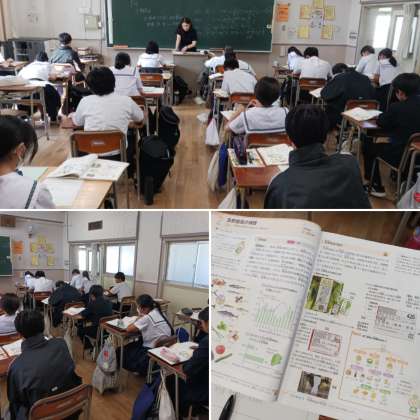2年生の家庭科の授業の様子です。「生鮮食品の特徴」について学習しています。普段、スーパーで売っている生鮮食品のラベルの意味についても教科書で確認しています。買い物に行ったときや、お家の方が買ってきてくれたものを見てみると、授業での理解が深まりますね。