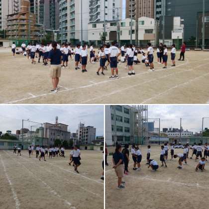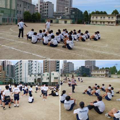 1年生の体育の授業の様子です。体育大会の個人種目の内容やルール確認、並び方について指示を受けています。