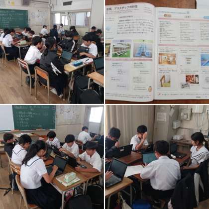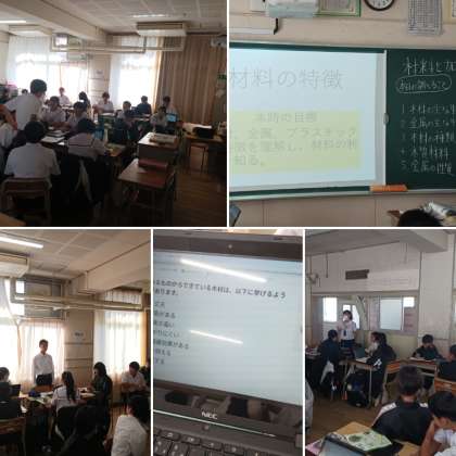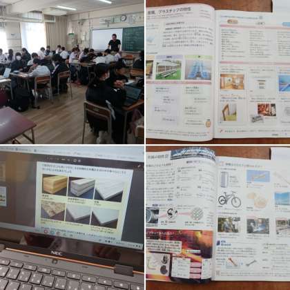 1年生の技術の授業の様子です。「材料加工の技術」について学習しています。今日はものづくりに必要な木材や金属、プラスチックの特徴を調べ、各班の代表が頑張って発表を行いました。来週以降は更に細かく学習していきます。