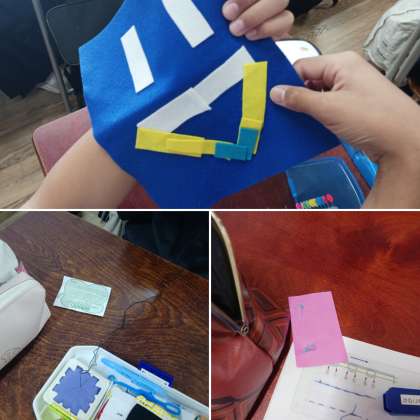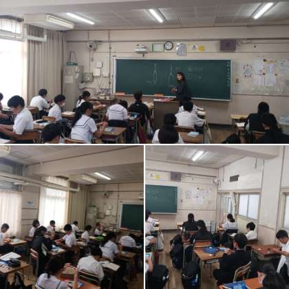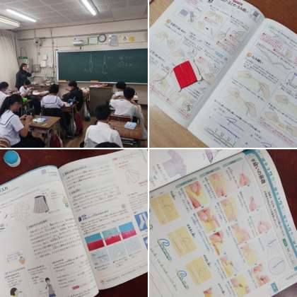 1年生の家庭科の授業の様子です。今日は「裁縫」を行っています。小学生で学習した内容の復習をしました。その後、「たまどめ」と「たまむすび」の学習をしました。先生からやり方を教わった後、指示された課題について各自で針と糸を使って練習しました。