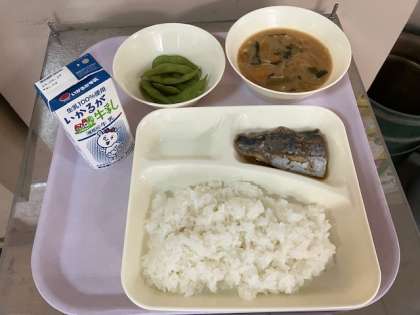 今日の給食は、ごはん、みそ汁、牛乳、さごしのしょうゆ煮、えだまめ、です。